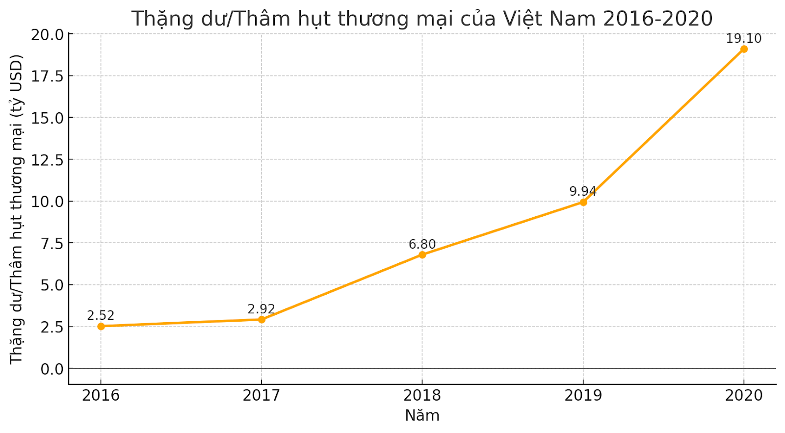 - Cán cân thương mại: Từ 2016 đến 2020, Việt Nam liên tục ghi nhận thặng dư thương mại, với xuất khẩu tăng mạnh nhờ vào các hiệp định thương mại tự do và tăng cường chuỗi cung ứng toàn cầu. Nhập khẩu cũng tăng nhưng không mạnh bằng xuất khẩu.