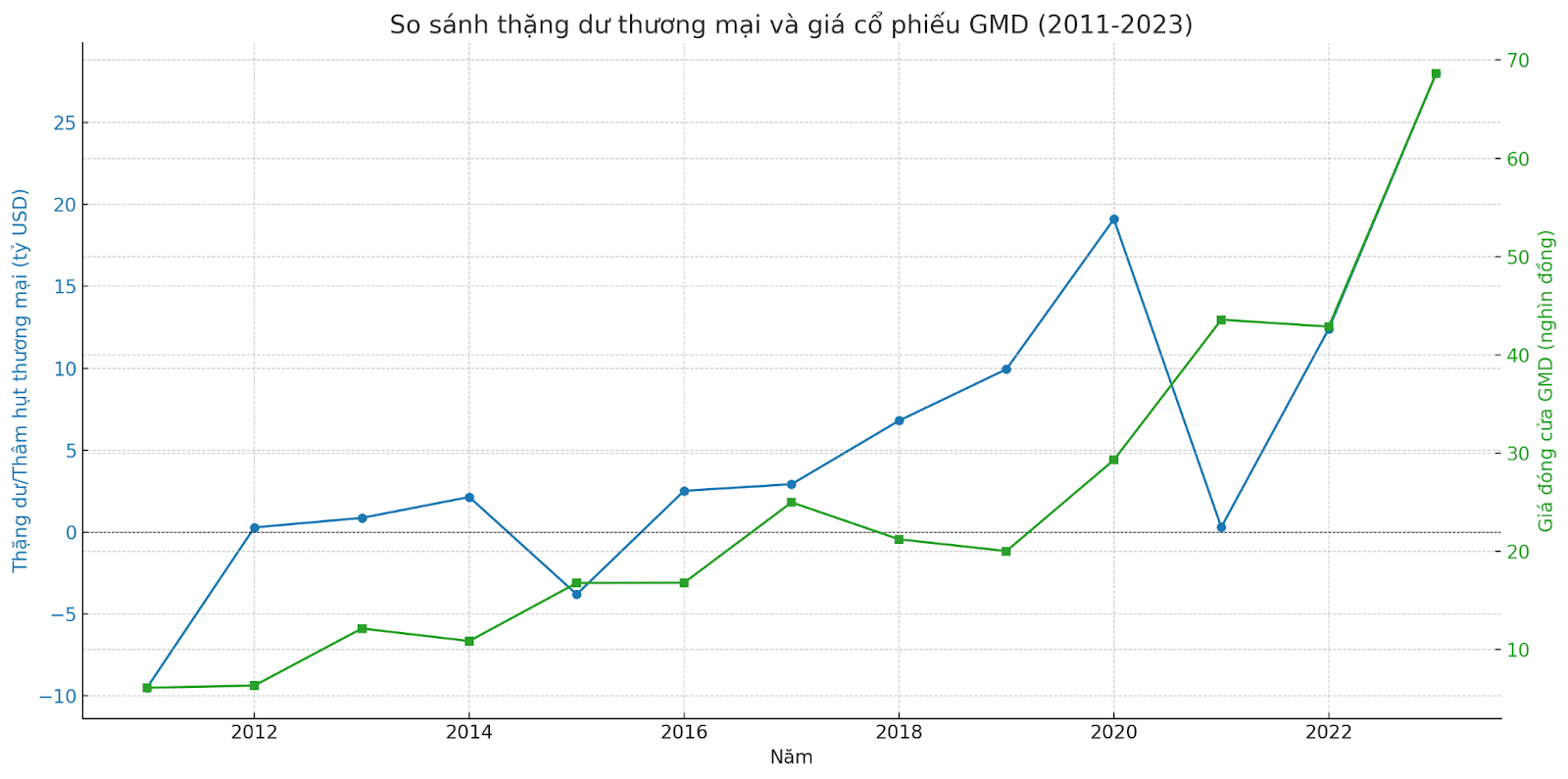 - Các năm có thặng dư thương mại ổn định hoặc tăng cao (như 2017-2018) cũng trùng với giai đoạn giá cổ phiếu GMD có xu hướng đi lên.